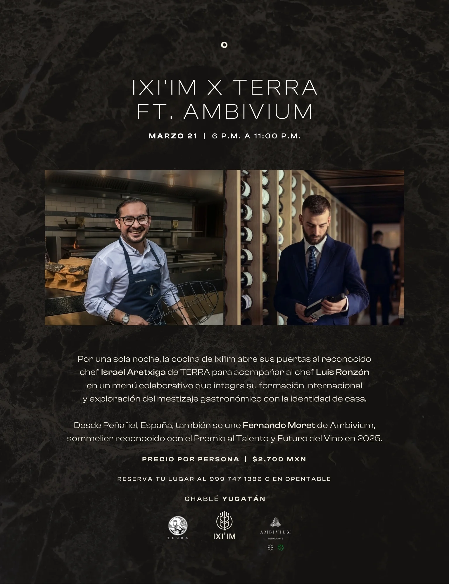 Por una sola noche, la cocina de Ixi’im recibe al chef Israel Aretxiga de Terra, quien acompañará al chef Luis Ronzón en un menú colaborativo que celebra el mestizaje gastronómico y la identidad de casa.